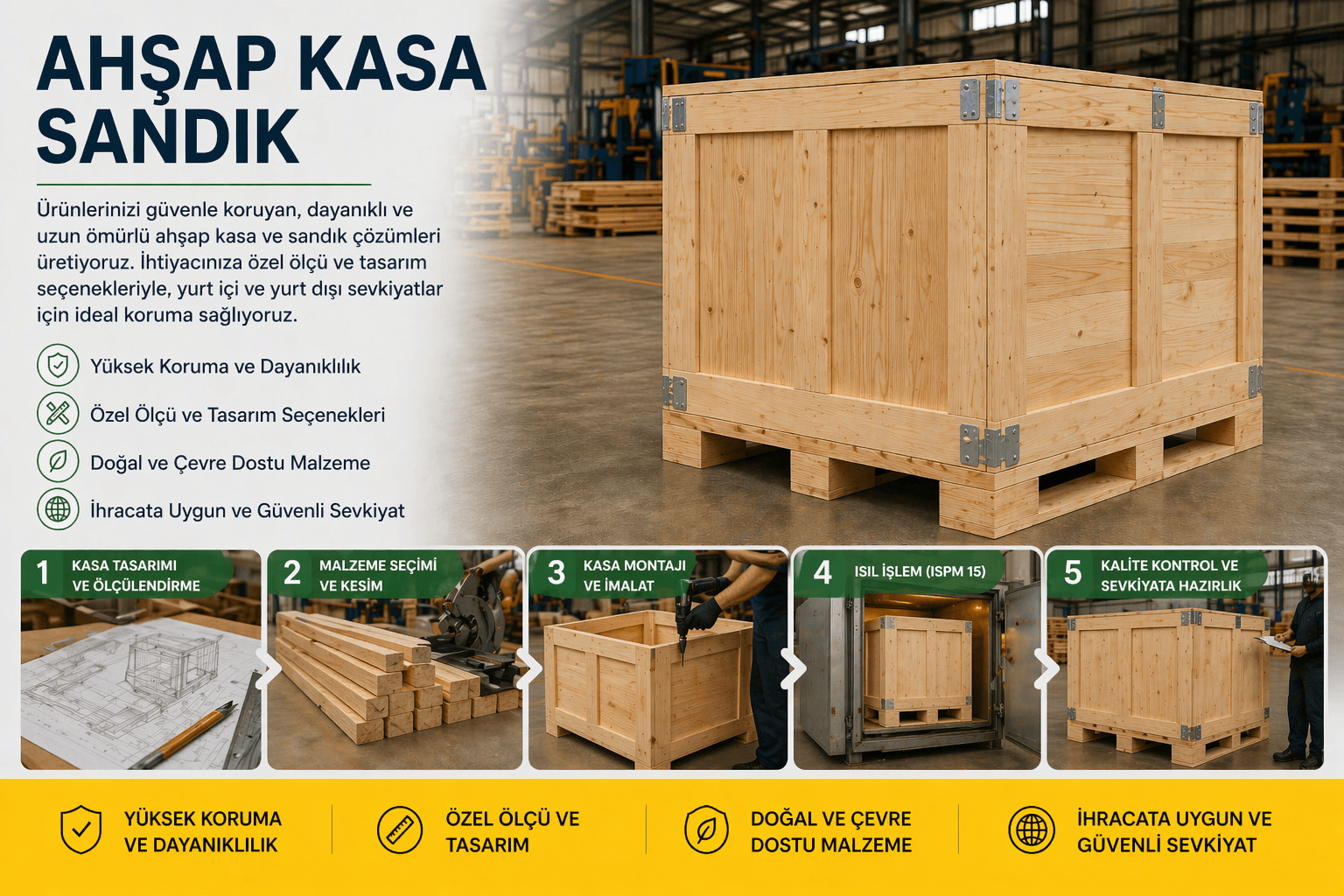 Ahşap kasalar, ihracat aşamalarında ürünlerinizin güvenli bir şekilde taşınması ve depolanması için firmamız tarafından profesyonelce üretilmektedir.