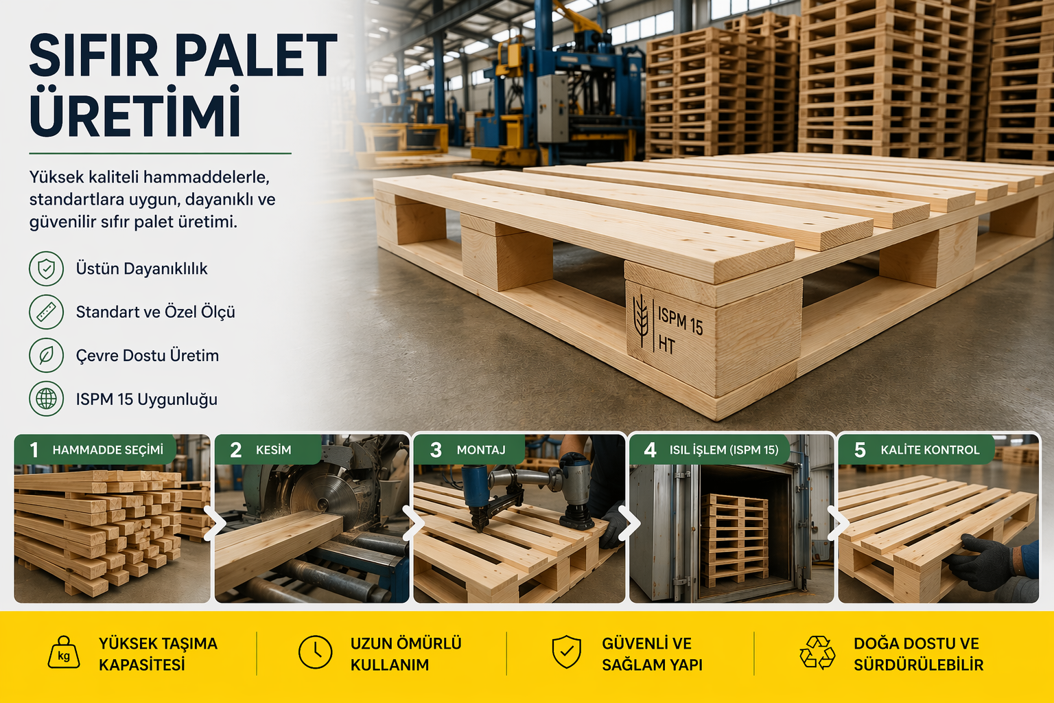 Firmamız, farklı sektörlerin taşıma ve depolama ihtiyaçlarına yönelik yüksek kaliteli sıfır palet üretimi gerçekleştirmektedir. Dayanıklılık, güvenlik ve uzun ömürlü kullanım esas alınarak üretilen paletlerimiz, lojistik süreçlerinizde maksimum verimlilik sağlar.
